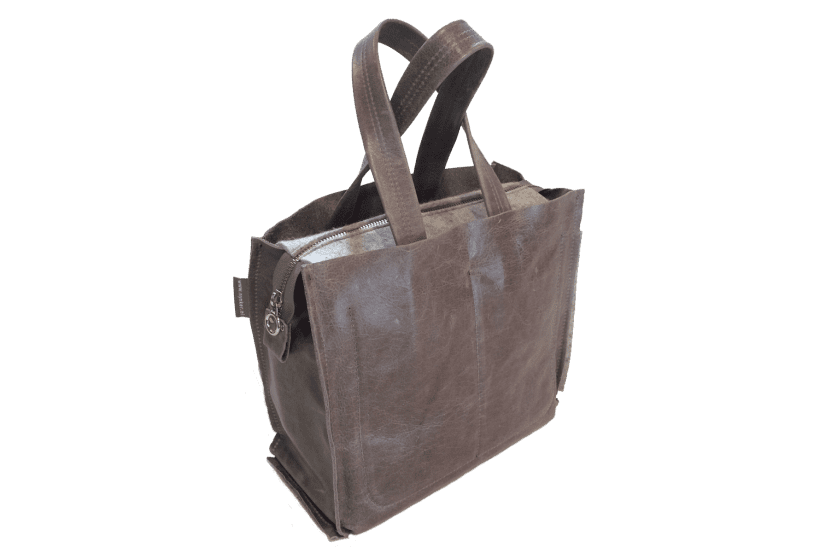 Let op het bijzondere detail: het wolvilt van het binnenwerk komt aan de kopse kant van de tas als detail door de naad naar buiten. Hengsels zijn